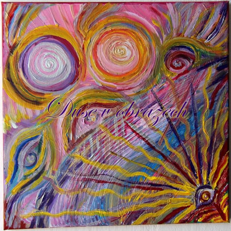 Plátno - akryl 40x40 Prosazení si sebe sama, projasnění překážek a bloků v oblasti krční a srdeční čakře. Dodávání energie k prosazení, sebelásce, komunikaci.